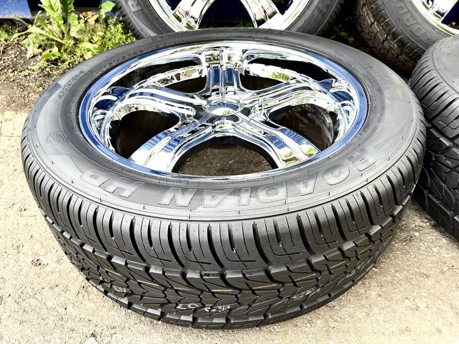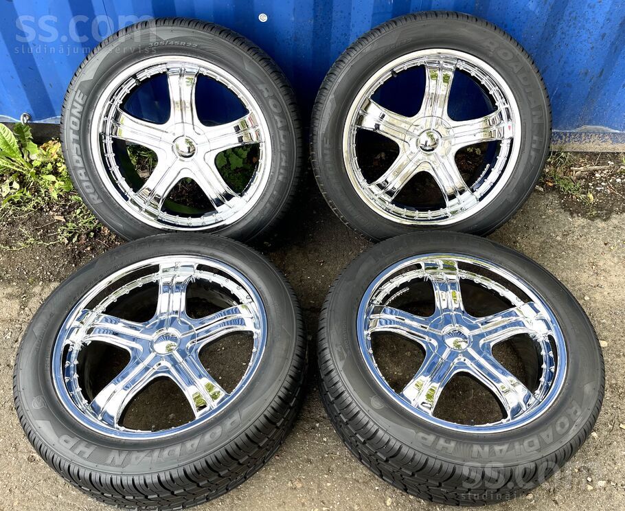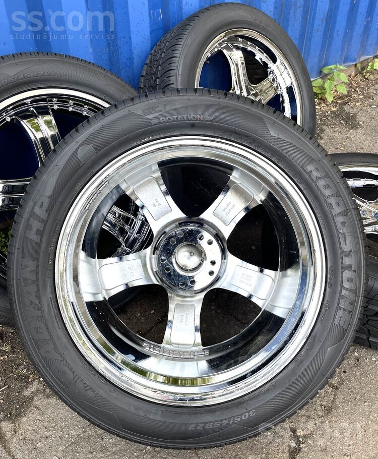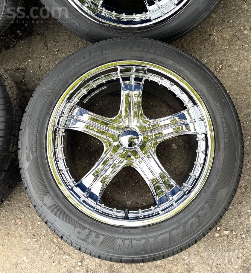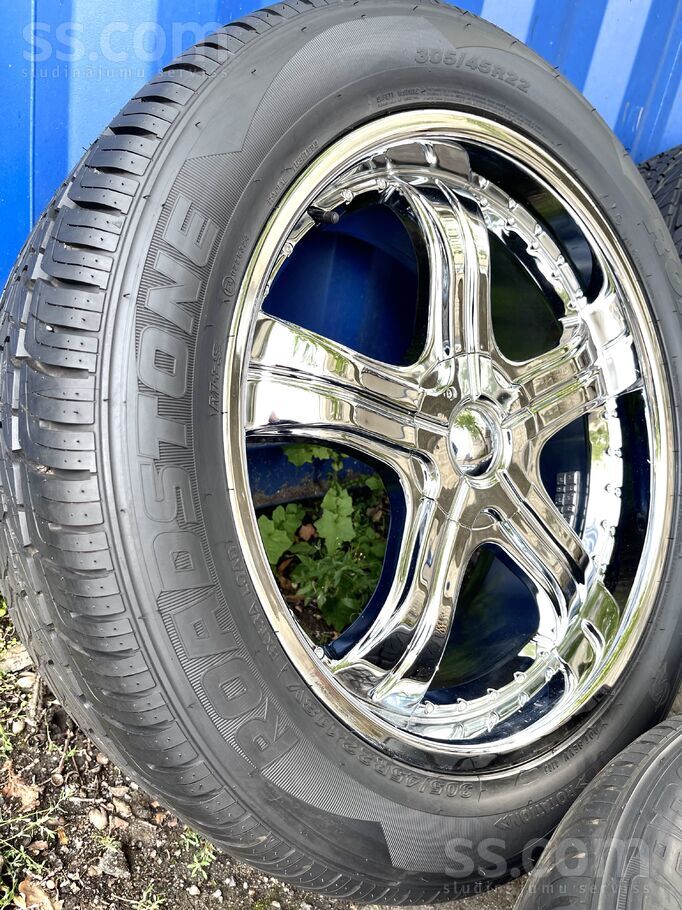 R22.; Et-55.; 7, 5J. ; dia-77, 8.;dia-5x127 un 5x139, 7. Un riepas 305/45R22. Cena norādīta par disku un Riepu komplektu (nav lietoti). Uz vietas ir iespējams piemērīt diskus uz jūsu auto un piemeklēt diskiem riepas. Ir gan jaunas, gan lietotas riepas piedāvājumā.